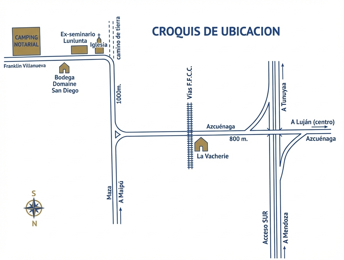 El Camping Notarial se encuentra en calle Franklin Villanueva sin número, Lunlunta, Maipú. A 700 metros aproximadamente de la Capilla de Nuestra Señora del Tránsito, y cuenta con 4.000 metros cuadrados parquizados, para la recreación y esparcimiento de los notarios y sus invitados.